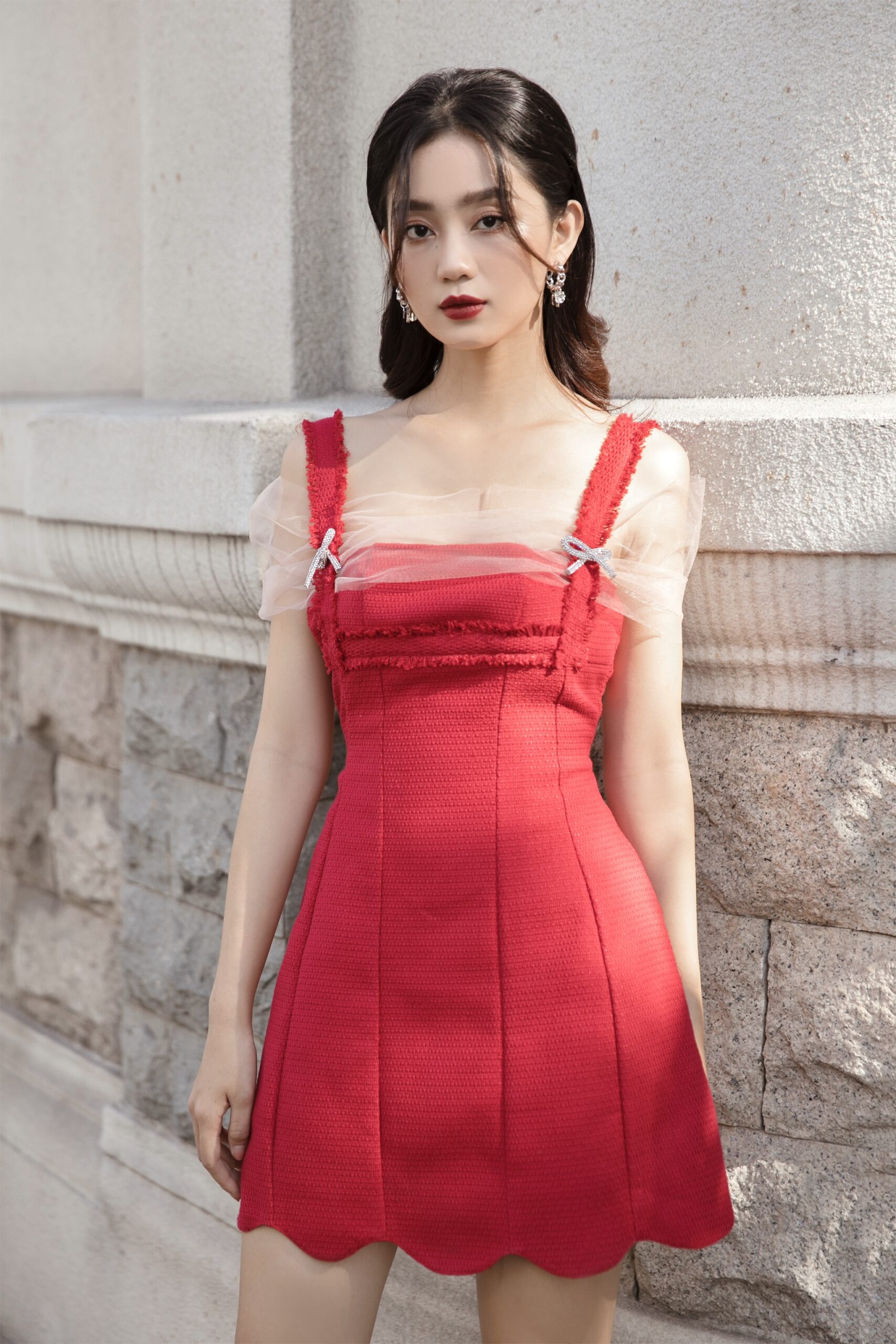 Đầm đỏ xòe lai đăng, xé tua đính vuông ở ngực, phói voal lưới, đính 2 nơ đá nhỏ