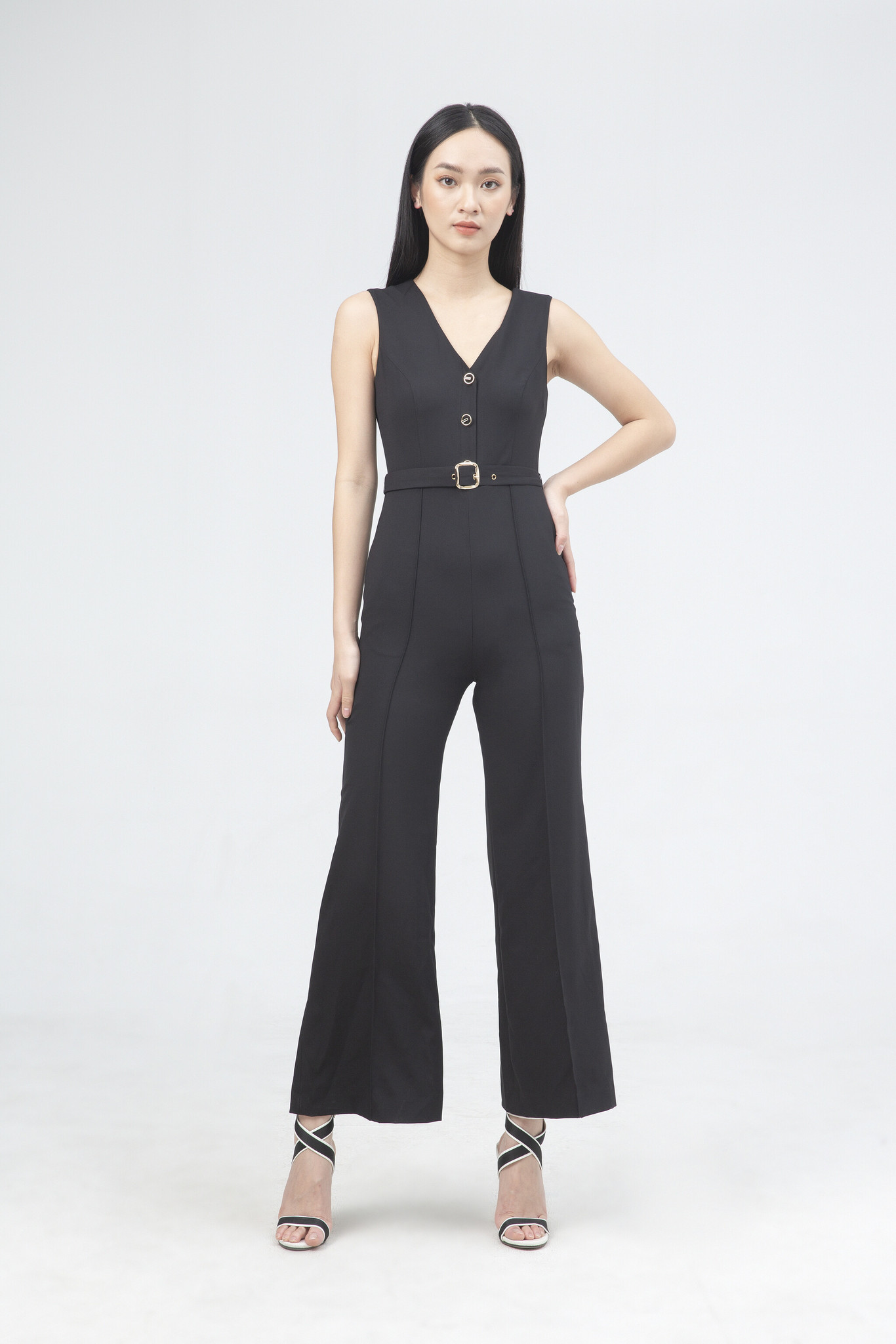 Jumsuits body sát nách, cổ chữ V, chiết eo có đỉa, đai khóa kim loại