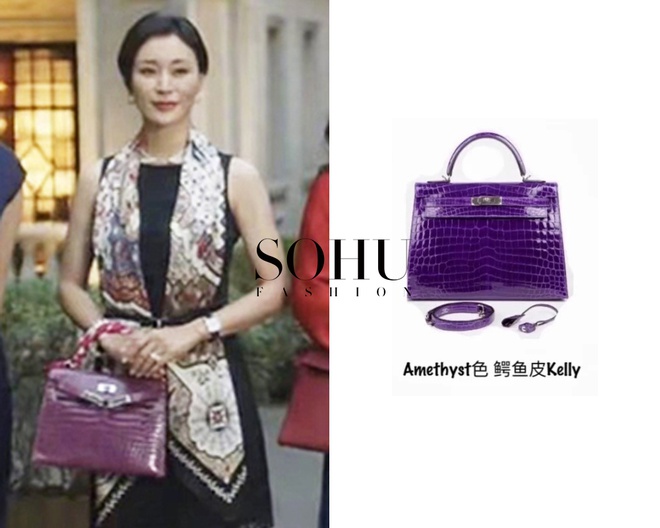 Chị Vương - người sống tại căn hộ sang trọng nhất trong toà nhà Cố Giai sống cũng là người dẫn dắt cô làm quen với những phụ nữ thượng lưu khác - chứng tỏ đẳng cấp qua việc mang theo thiết kế Hermès Kelly Amethyst màu tím đẹp mắt. Vị phu nhân này còn trang trí túi bằng khăn lụa tinh tế. Giá của mẫu túi không hề được công khai. Ảnh: Sohu.